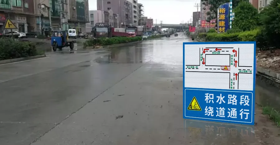 像积水路段,应提前200-300米设置“绕行提示”,更要在前一入口或辅道口设置分流引导,给人留出反应时间。
