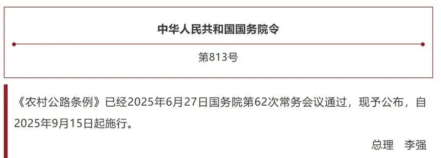 “为了推动农村公路发展实现乡村振兴,《农村公路条例》被国务院通过,于2025年9月15日起施行。”