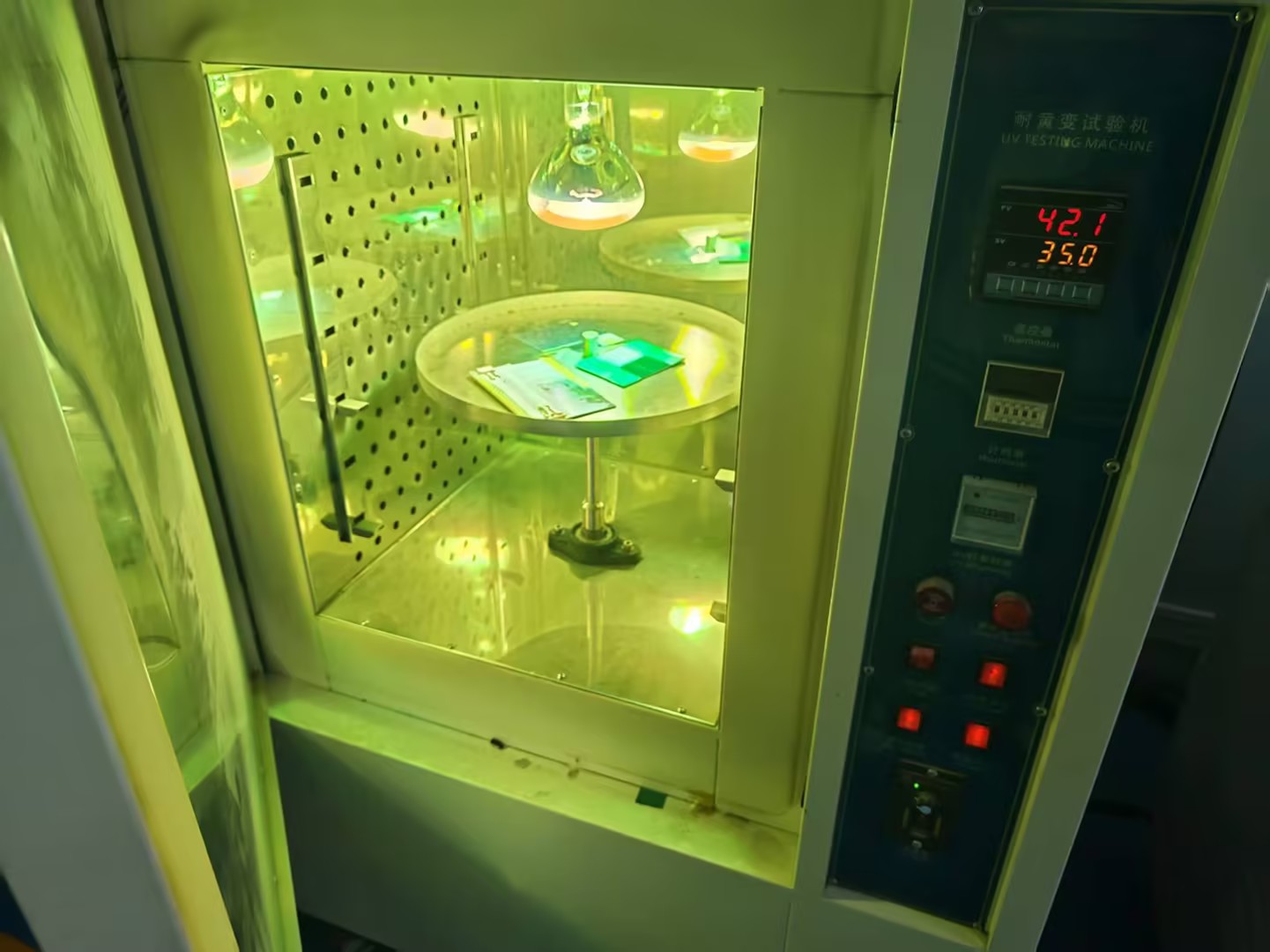耐候性的测试可以通过人工加速老化试验(老化试验箱采用氙弧灯作为光源,箱内黑板温度选择65℃±3℃,相对湿度选择50%±5%)来检测。