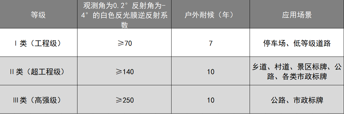 根据表格图片我们能看出国标II类超工程级反光膜的优势,其逆反射系数要求是国标I类工程级反光膜的2倍高,使用寿命同国标III类高强级反光膜相同都是10年。