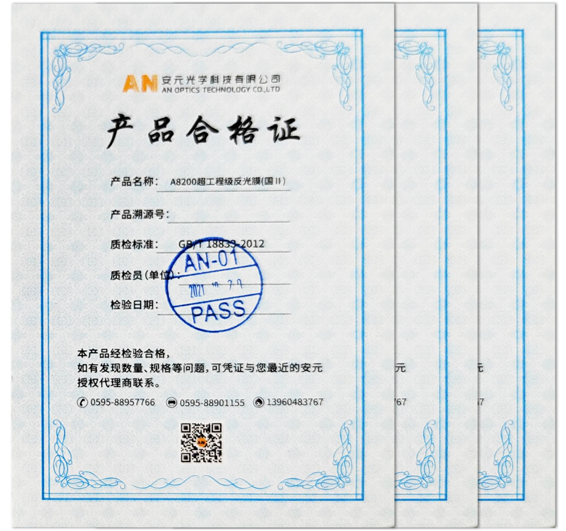 并且要确认检测机构的资质和验证报告的时效性,正规的国标反光膜还提供质量保证,如安元A8200反光膜提供国标相应质保年限。