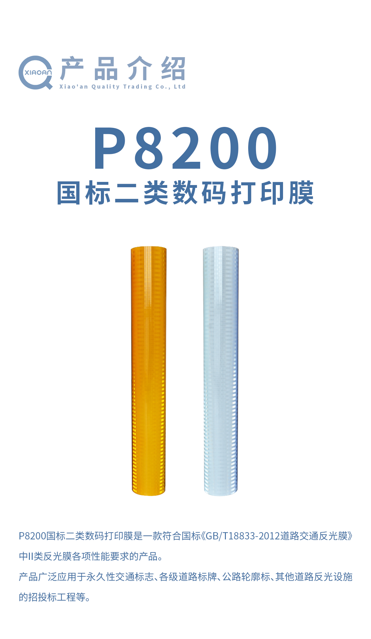 P8200国标二类数码打印膜是一款符合国标《GB/T18833-2012道路交通反光膜》中I类反光膜各项性能要求的产品。