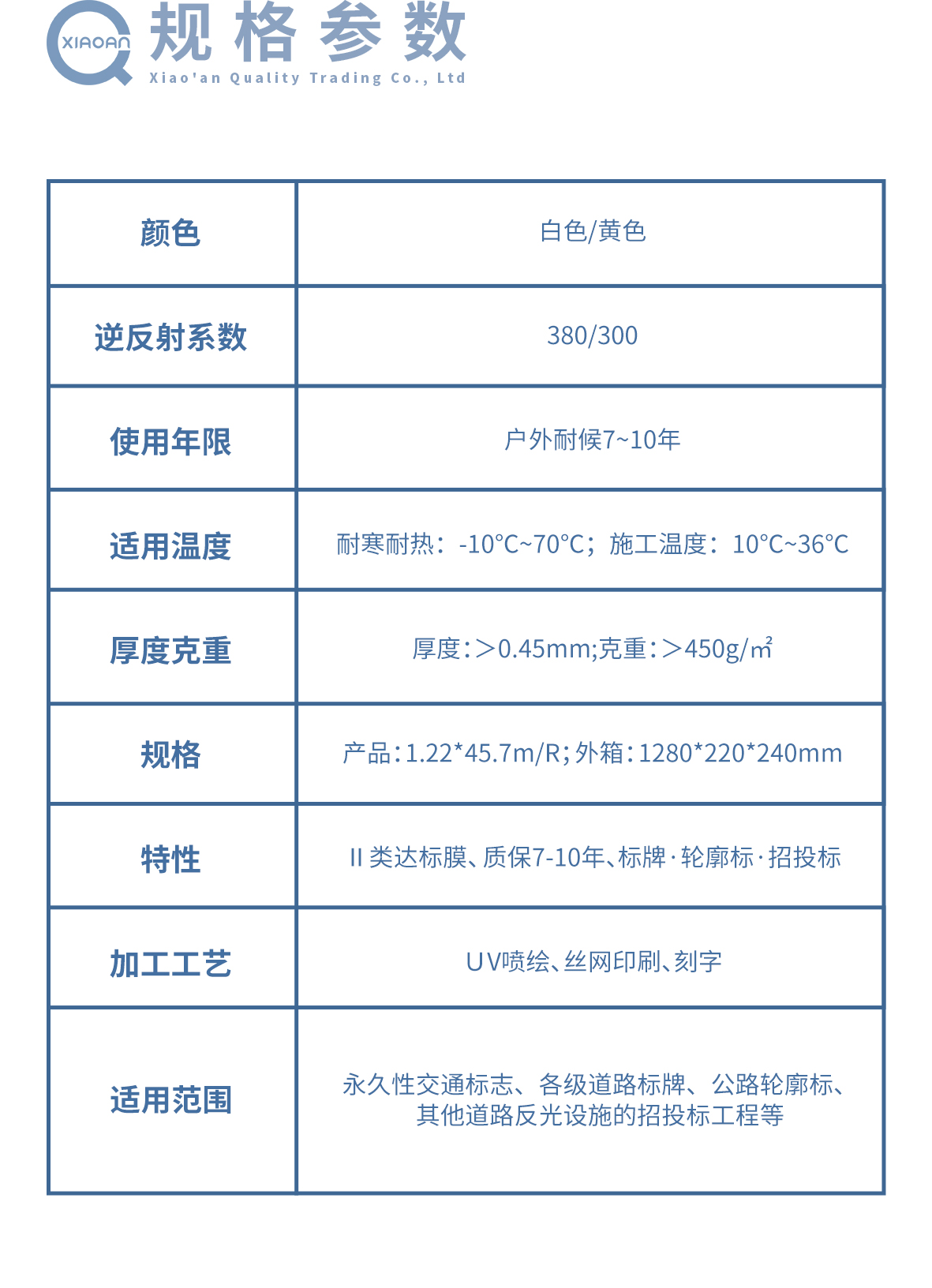产品广泛应用于永久性交通标志、各级道路标牌、公路轮廓标、其他道路反光设施的招投标工程等。