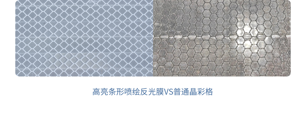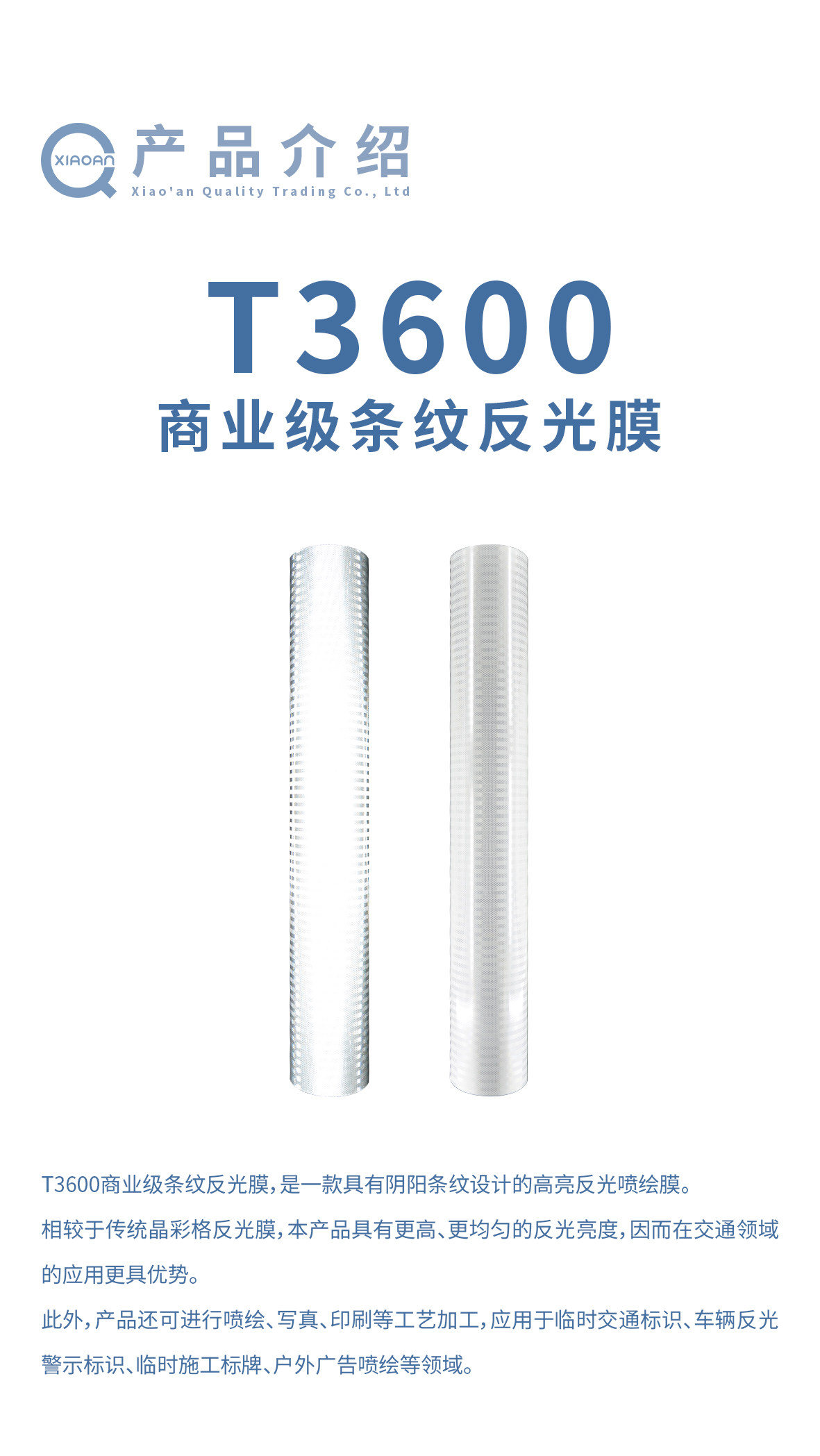 T3600商业级条纹反光膜,是一款具有阴阳条纹设计的高亮反光绘膜。相较于传统晶彩格反光膜,本产品具有更高、更均匀的反光亮度,因而在交通领域的应用更具优势。