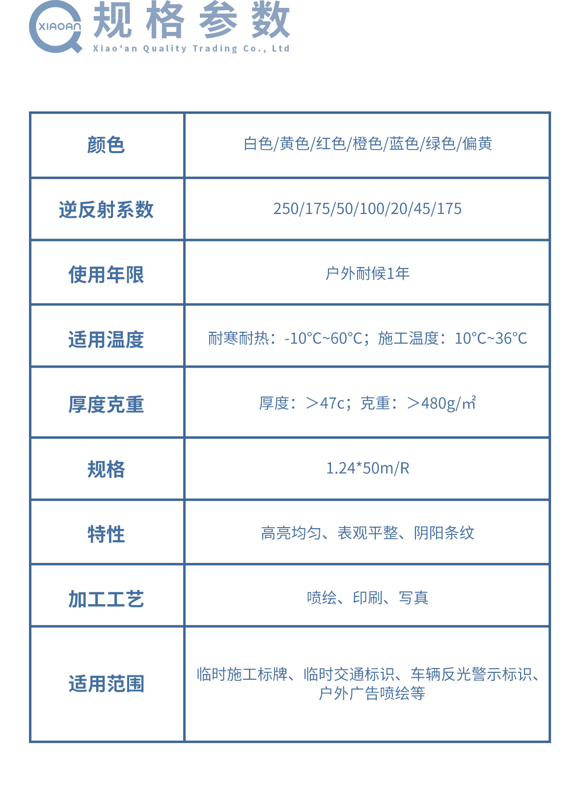此外,产品还可进行喷绘、写真、印刷等工艺加工,应用于临时交通标识、车辆反光警示标识、临时施工标牌、户外广告喷绘等领域。